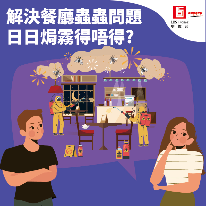 做餐廳食肆都避免不了會受到蟲害困擾,因為對小昆蟲而言,這些場所溫度濕度適宜,是一個不可多得的生活環境。但對商家而言,佢地嘅出現會令餐廳形象負面。這個時候就可以用焗霧形式將牠們一網打盡,利用霧化了的殺蟲劑將其滲透每個罅隙及空間,令藏在縫隙的小昆蟲無路可走而被消滅。