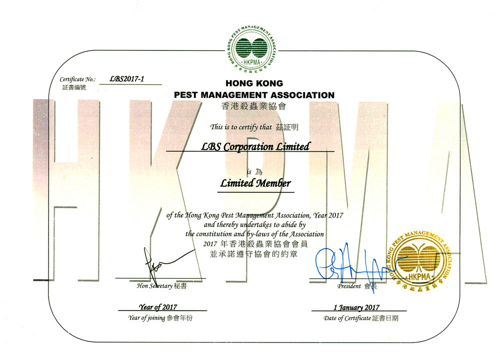 為持續提供優質及專業的滅蟲管理服務予客戶,我們在兩岸四地取得各類認可的滅蟲資格。