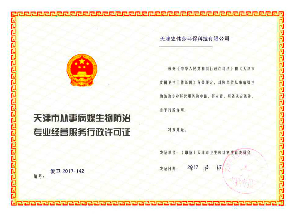 在中國大陸,我們獲得由各個有害生物防制協會及衛生和計劃生育委員會所頒發的資質證書和許可證,也取得國際認可的ISO9001(質量管理體系認證)及ISO14001(環境管理體系認證)證書。