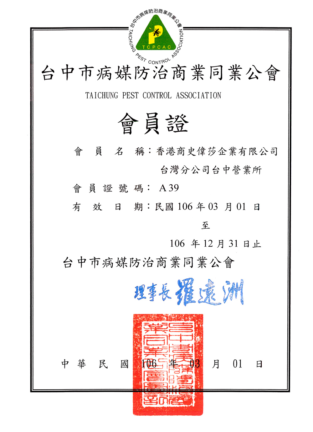 在台灣,我們按法規考取病媒防治業許可執照,工作的技術人員也擁有由行政院環境保護署頒授的病媒防治合格證書。我們亦參與各個病媒防治商業同業公會,從而推動地區的衛生質素。