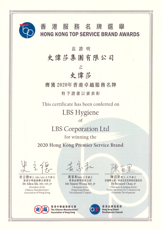 LBS Hygiene won "Hong Kong Top Service Brand Award 2016" after public voting and judgements. The award is based on 6 aspects including reputation in HK, Mainland China & overseas, operating characteristics, innovative ideas, quality, image and environmental protection and social responsibility. As a result, we have great development on different aspects and being recognized. We have been continuously recognized as "Hong Kong Top Service Brand" according to the evaluation annually. After years of evaluation, our outstanding service has been further recognized and get the "Hong Kong Premier Service Brand Award 2020".
